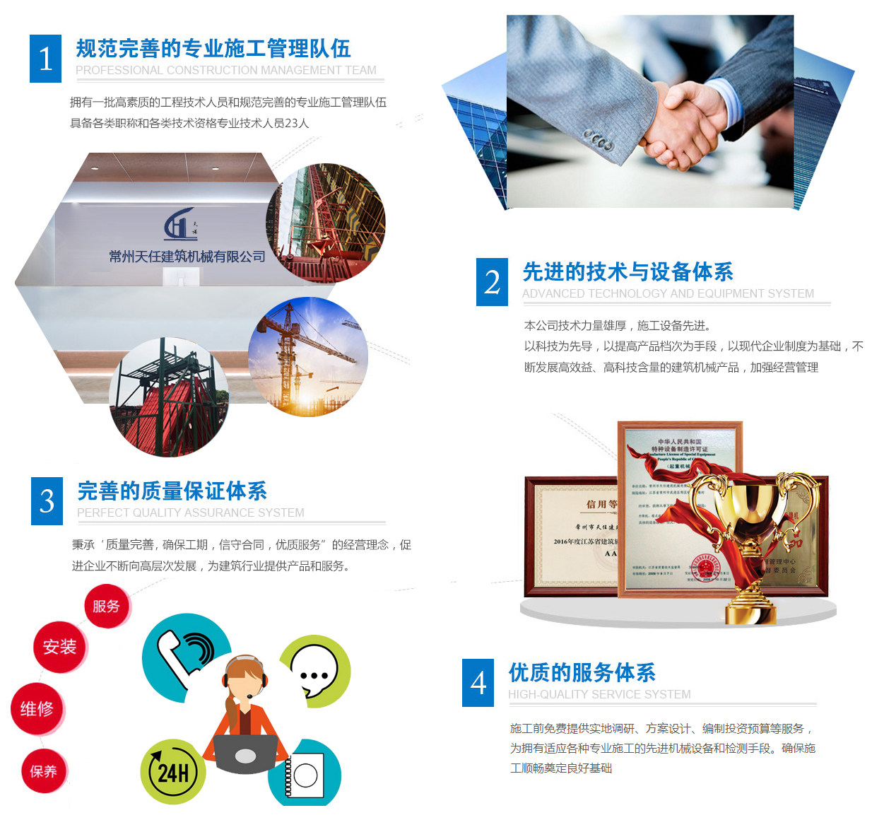 公司主要從事施工升降機(jī)、普通塔式起重機(jī)的制造、租賃、安裝、改造與維修等一條龍服務(wù);擁有施工升降機(jī)(SCD200/200、SC200/200),QTZ63型普通塔式起重機(jī),物料提升機(jī)(GJT10A)三大系列產(chǎn)品,并有中華人民共和國(guó)特種設(shè)備檢驗(yàn)檢疫總局頒發(fā)的制造、改造與維修生產(chǎn)許可證。